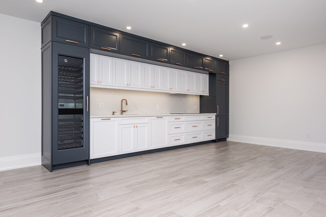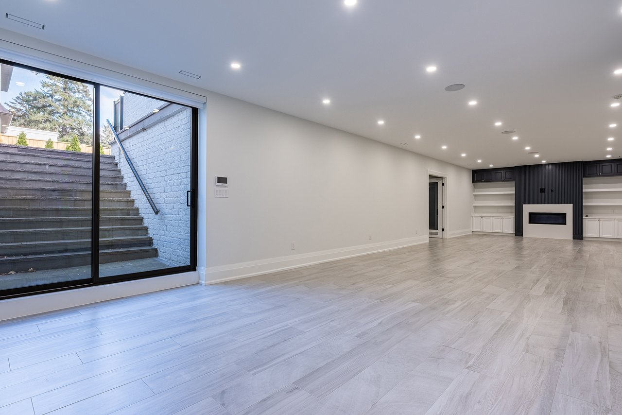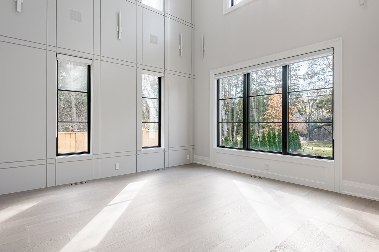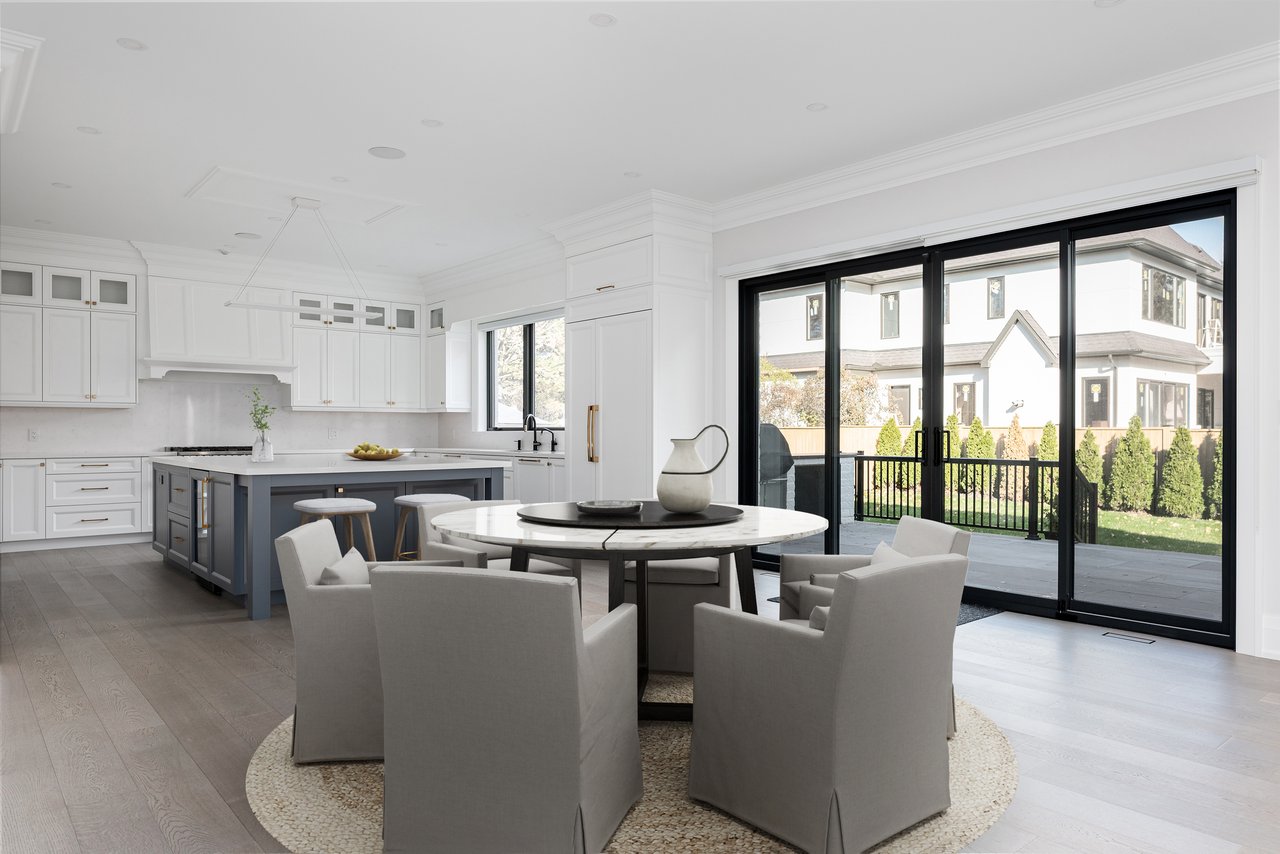 The foyer introduces the level of craftsmanship found throughout: heated marble tile flooring, plaster crown mouldings, poplar baseboards, and clean sightlines that draw natural light from multiple directions. Off the foyer, a bright office and a dramatic dining room establish the home’s architectural character. The dining room is a standout feature with its full-height custom panelling, elegant sconces, integrated speakers, and an impressive skylight that brings sunlight through both levels.
