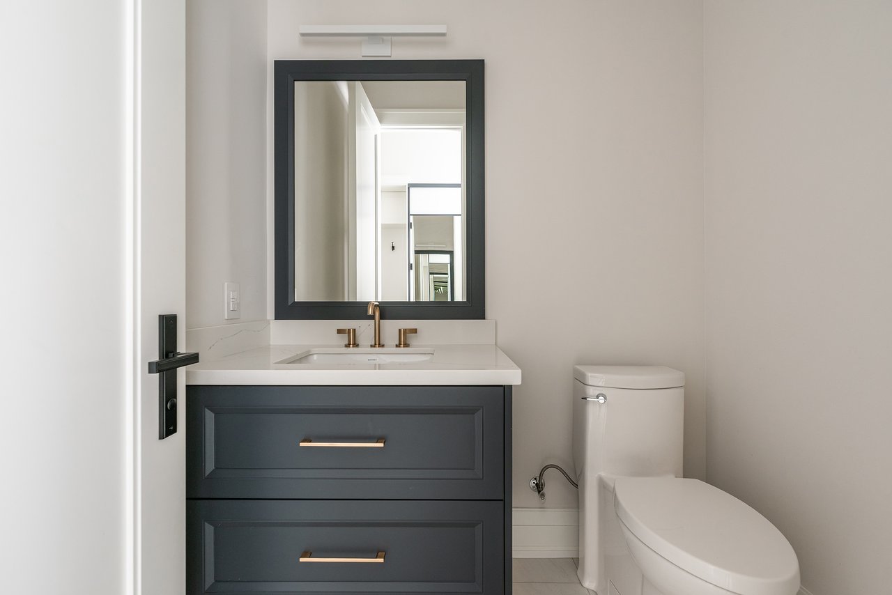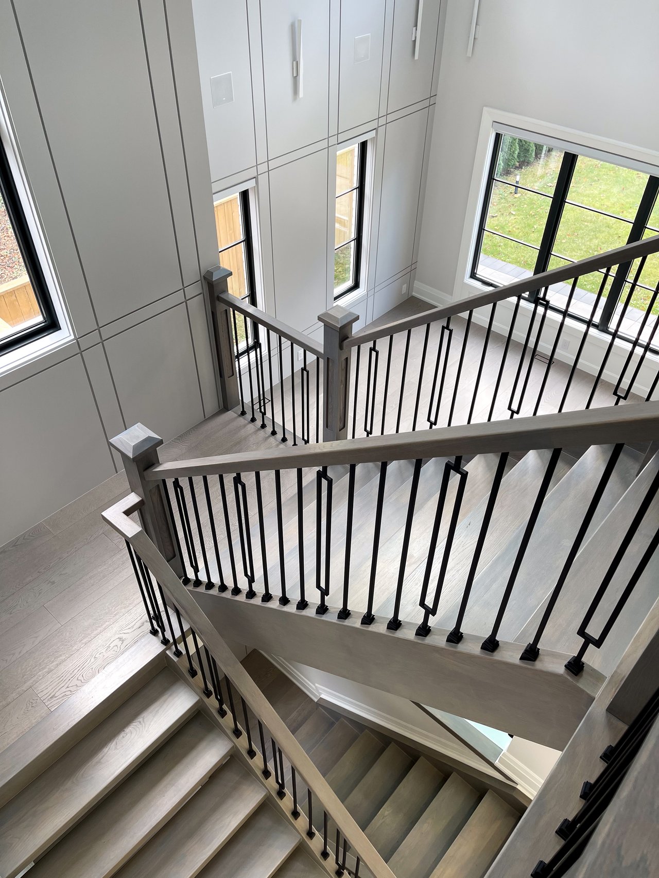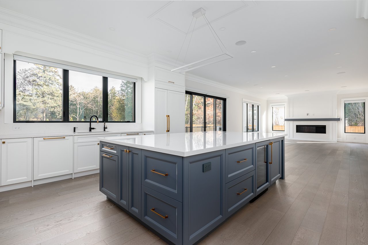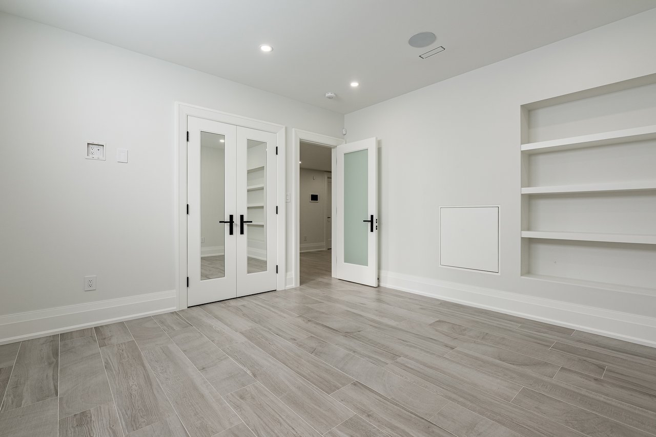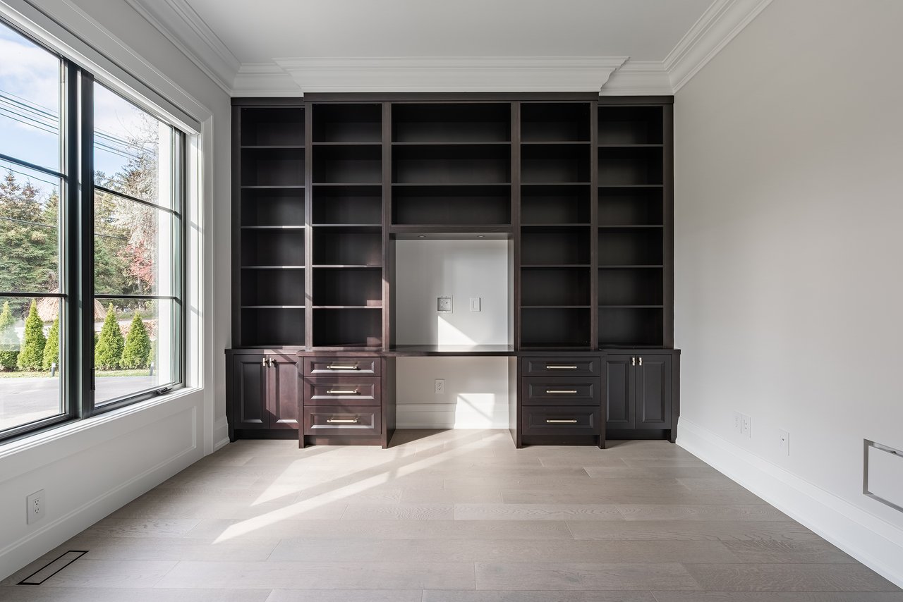 The foyer introduces the level of craftsmanship found throughout: heated marble tile flooring, plaster crown mouldings, poplar baseboards, and clean sightlines that draw natural light from multiple directions. Off the foyer, a bright office and a dramatic dining room establish the home’s architectural character. The dining room is a standout feature with its full-height custom panelling, elegant sconces, integrated speakers, and an impressive skylight that brings sunlight through both levels.
