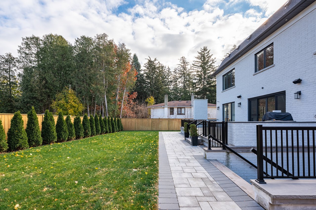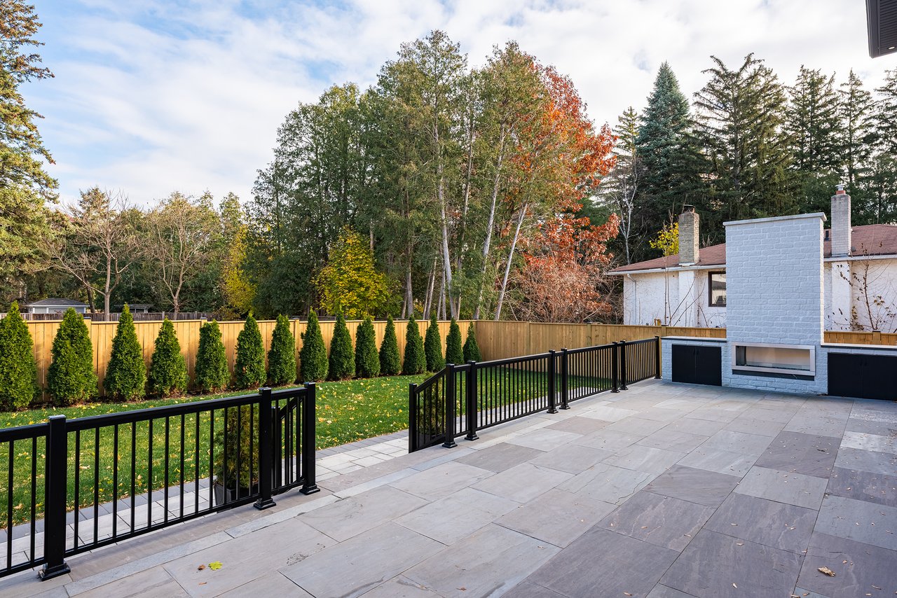 Outdoors, the property is designed for year-round enjoyment with a large stone terrace, gas fireplace, and outdoor kitchen with built-in BBQ. Tall fencing and mature surroundings provide privacy, while the generous lawn allows room for play and relaxation.