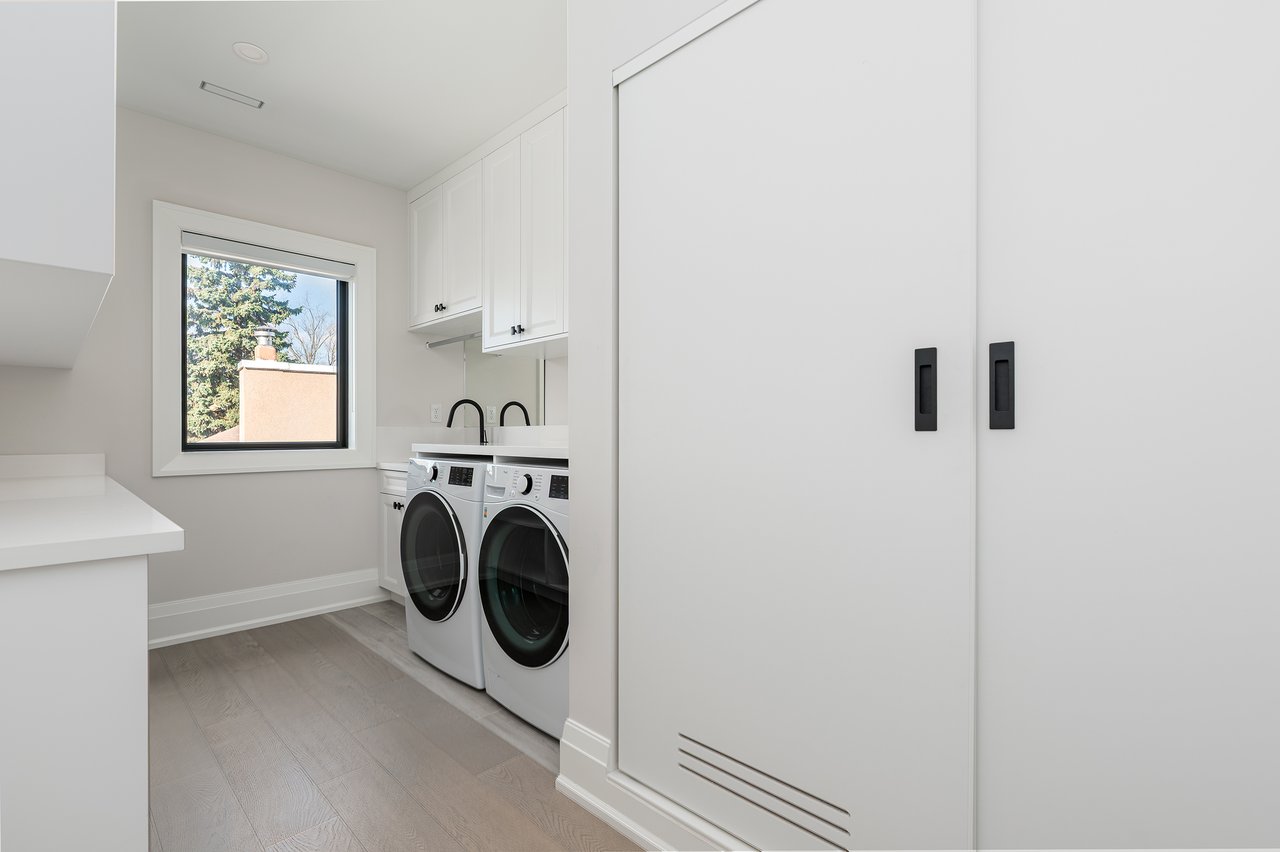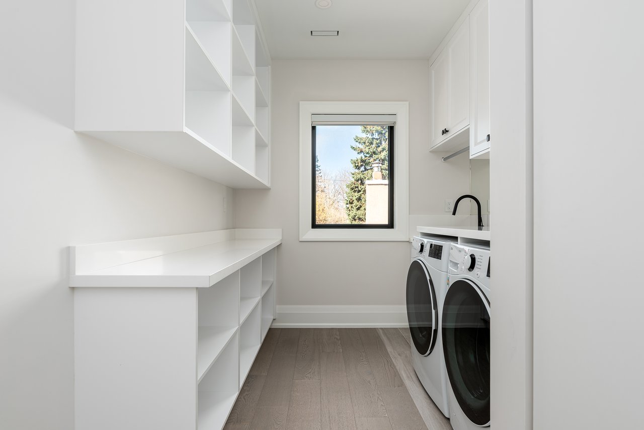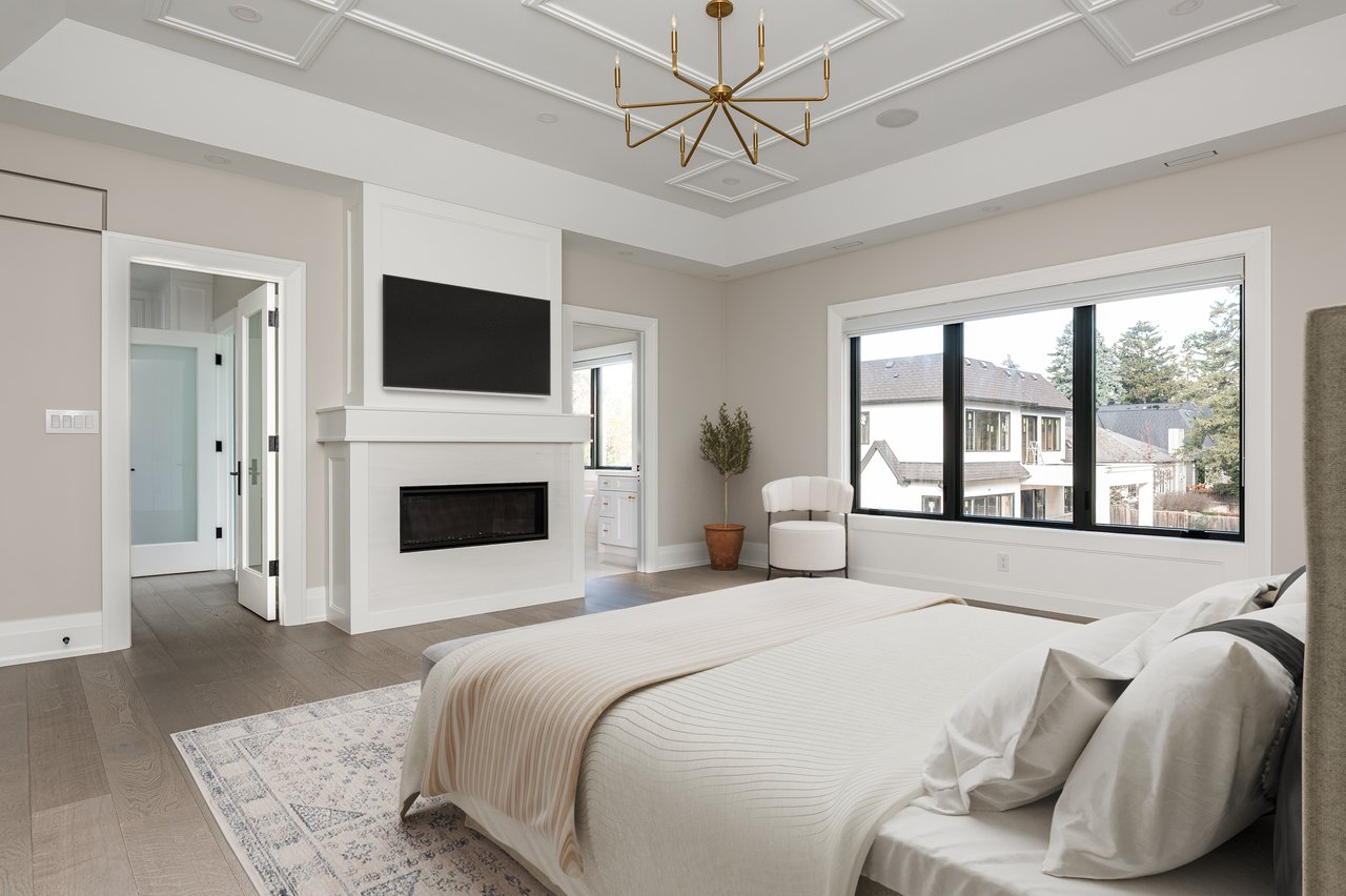 Upstairs, four generously scaled bedrooms provide private, ensuite-appointed comfort for the entire family. The primary suite offers a calming retreat with a fireplace, custom walk-in closet, and a luxurious ensuite featuring heated floors, a freestanding tub, glass shower, and water closet with frosted glass. A spacious laundry room with cabinets, folding counter, and LG appliances completes this level.