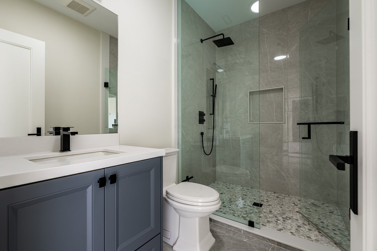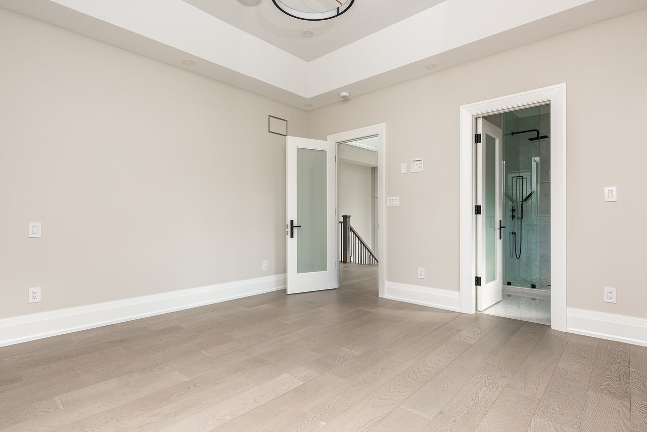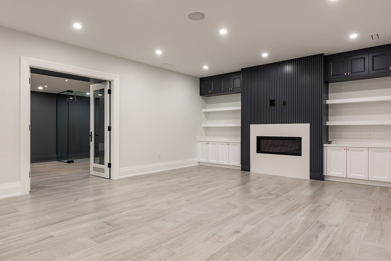 Upstairs, four generously scaled bedrooms provide private, ensuite-appointed comfort for the entire family. The primary suite offers a calming retreat with a fireplace, custom walk-in closet, and a luxurious ensuite featuring heated floors, a freestanding tub, glass shower, and water closet with frosted glass. A spacious laundry room with cabinets, folding counter, and LG appliances completes this level.
