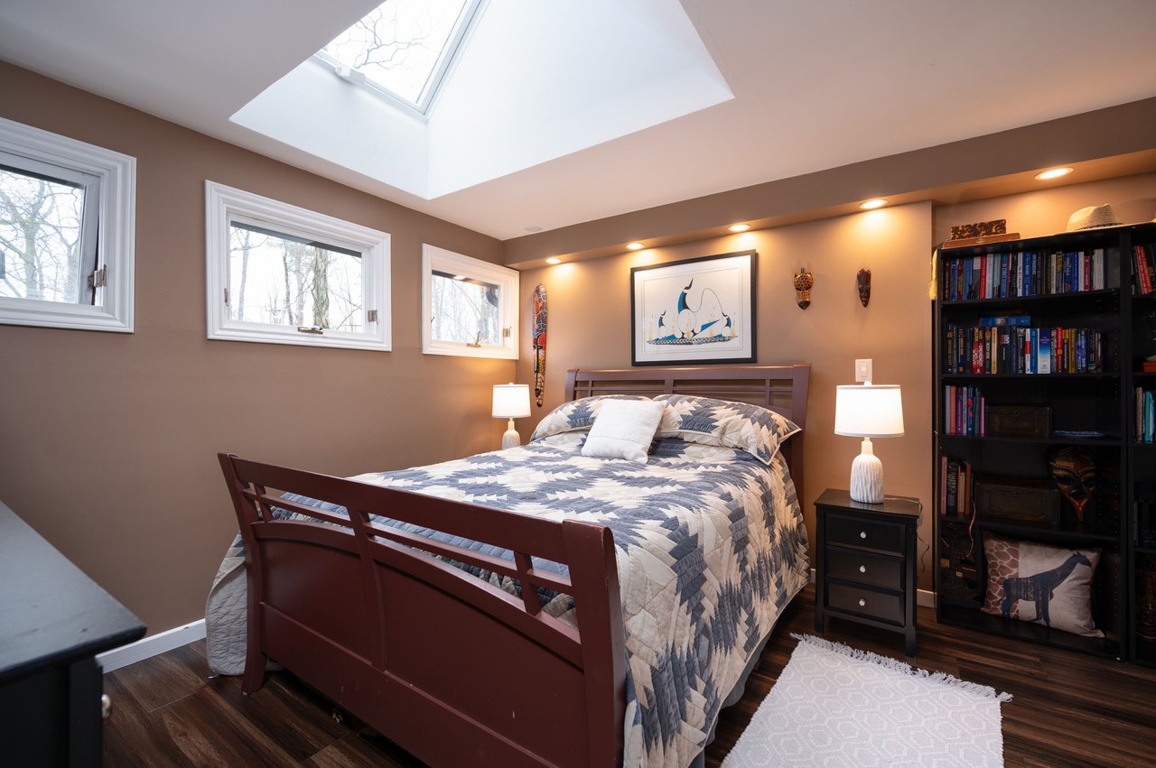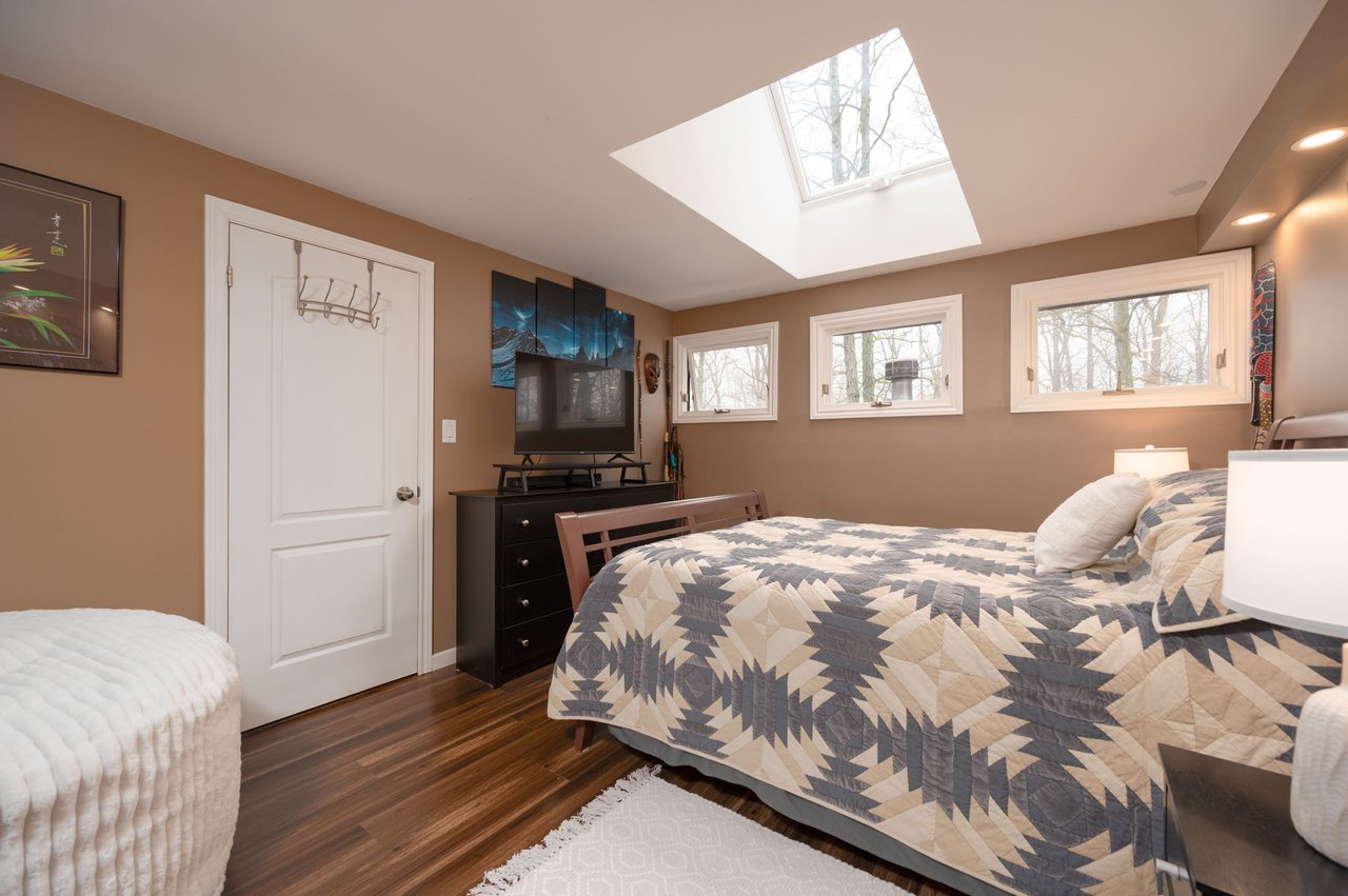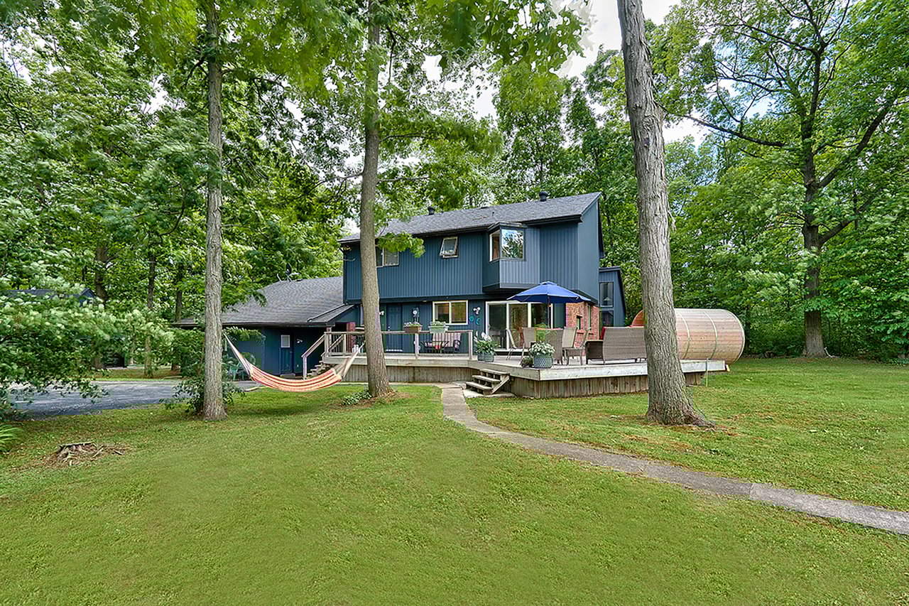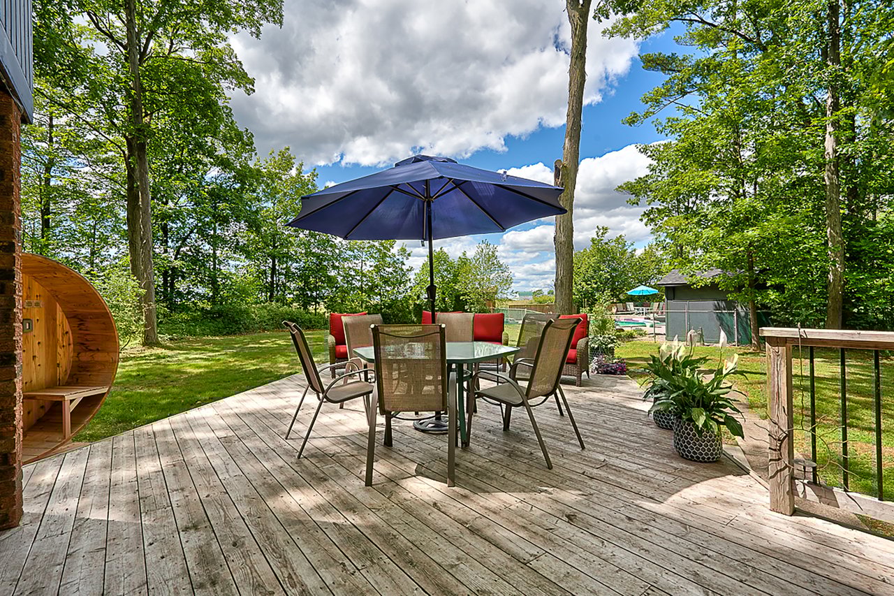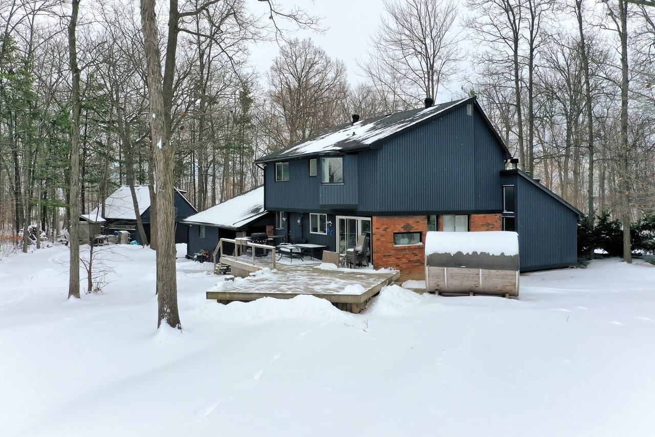 Tucked into nearly four acres of heavily treed grounds, the property delivers a true sense of retreat. The outdoor environment is designed for relaxed living and memorable entertaining, featuring expansive elevated decking, an inground pool framed by interlock stone, multiple lounging zones, a pool shed with tiki bar, hammock space, and a cedar barrel sauna for year-round enjoyment.