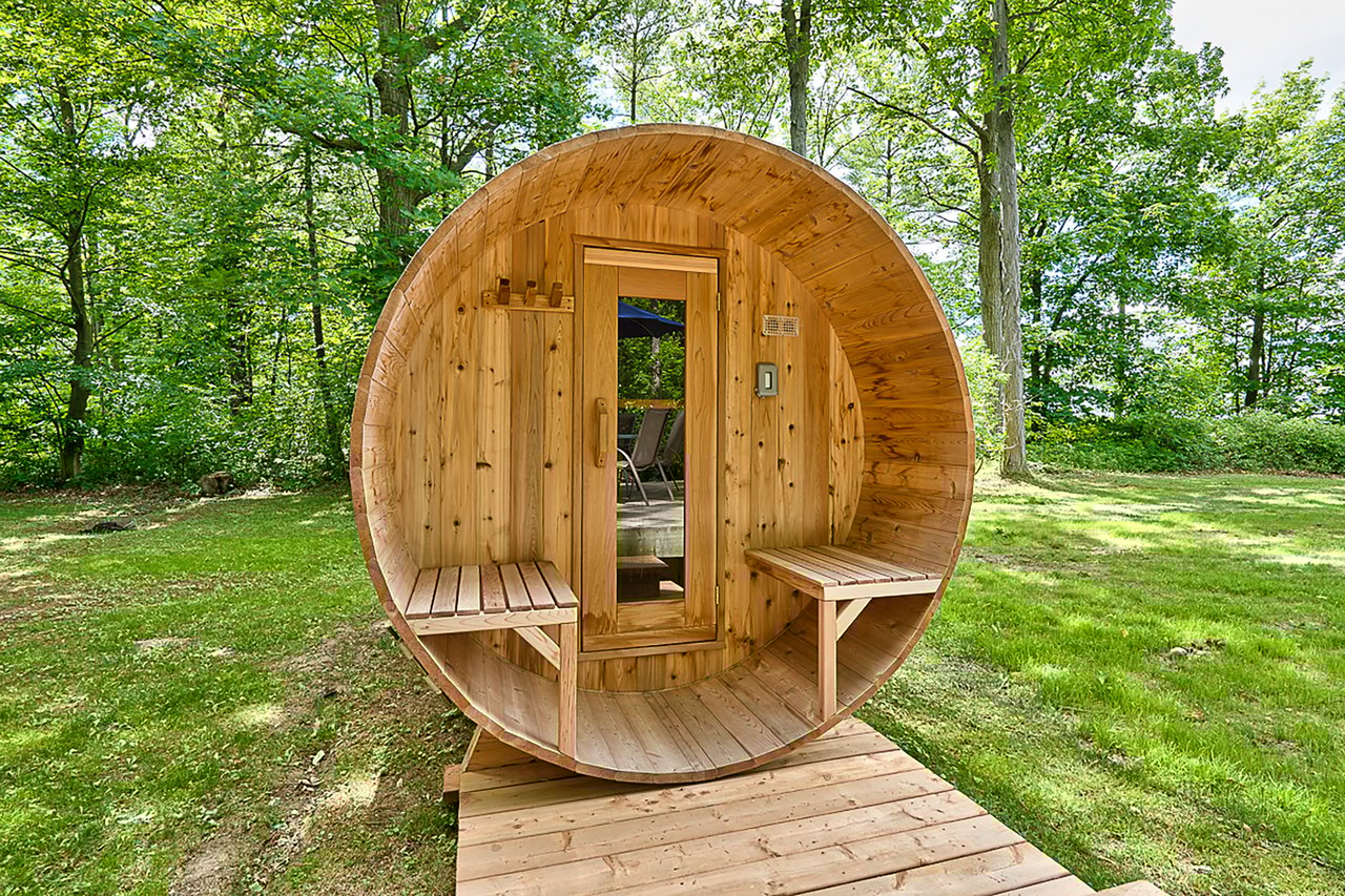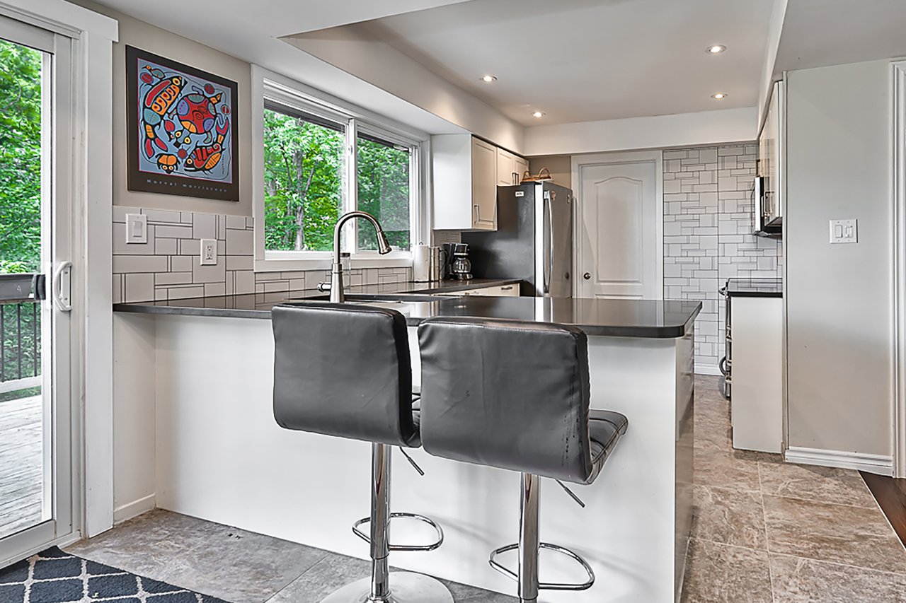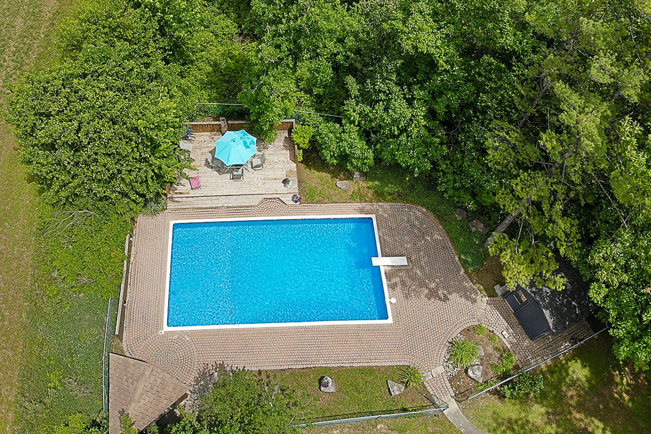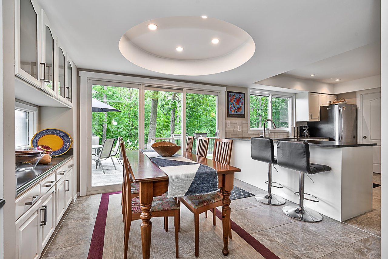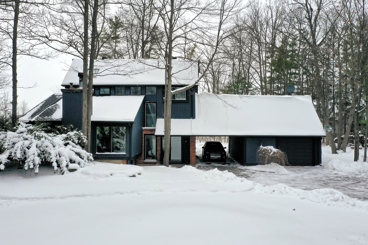 Tucked into nearly four acres of heavily treed grounds, the property delivers a true sense of retreat. The outdoor environment is designed for relaxed living and memorable entertaining, featuring expansive elevated decking, an inground pool framed by interlock stone, multiple lounging zones, a pool shed with tiki bar, hammock space, and a cedar barrel sauna for year-round enjoyment.