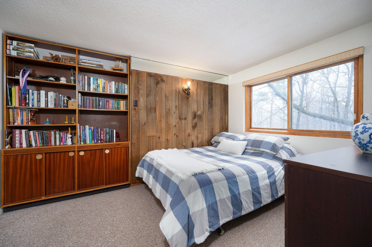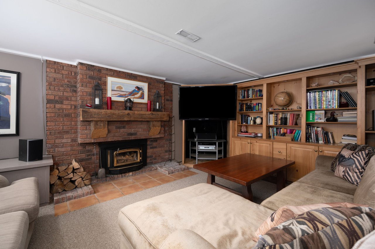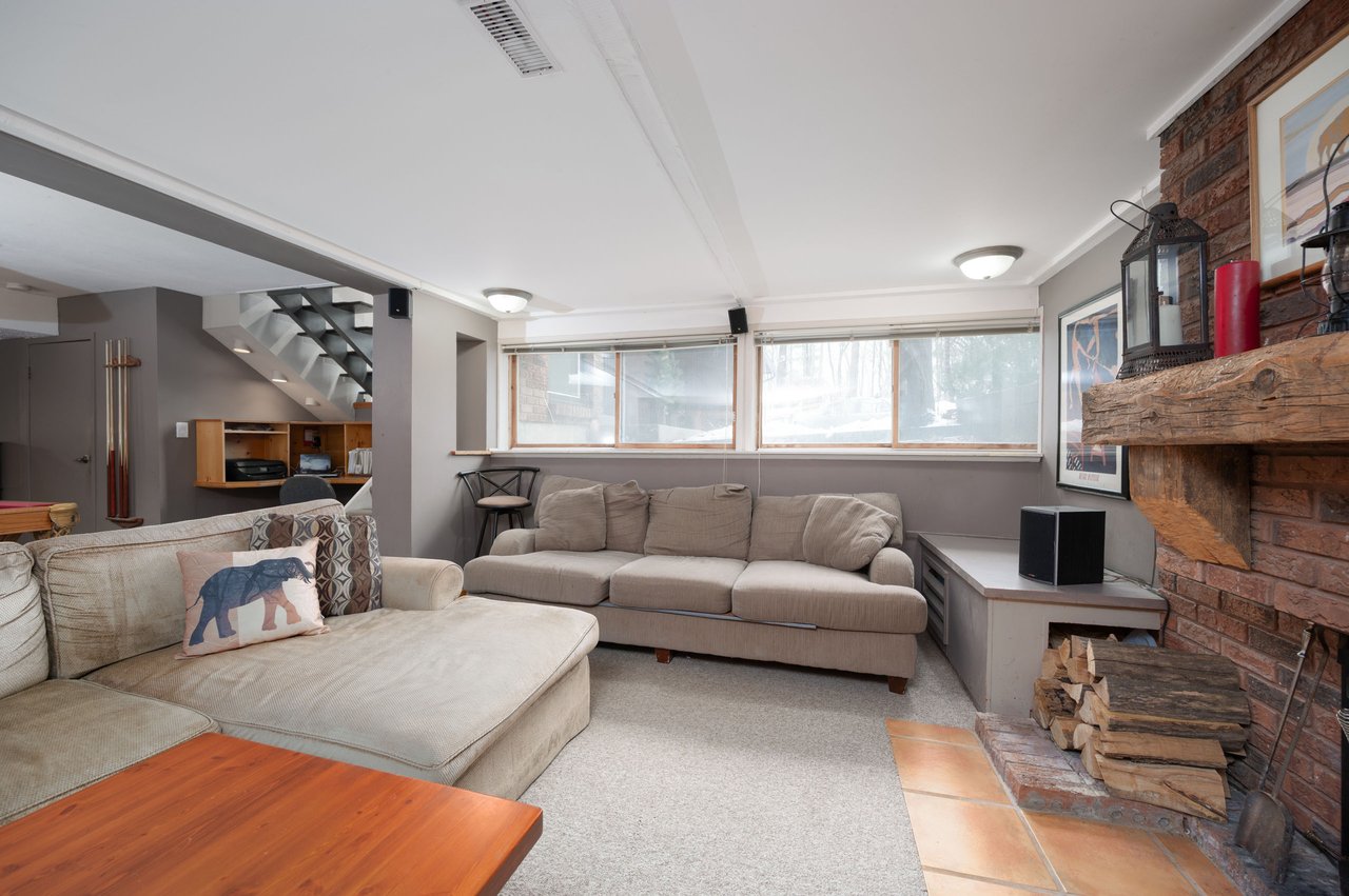 The finished lower level adds exceptional flexibility, offering oversized windows, a cozy recreation room with wood-burning fireplace and built-in cabinetry, a billiards area with bar and desk space, workshop, separate exterior entrance, and ample storage.