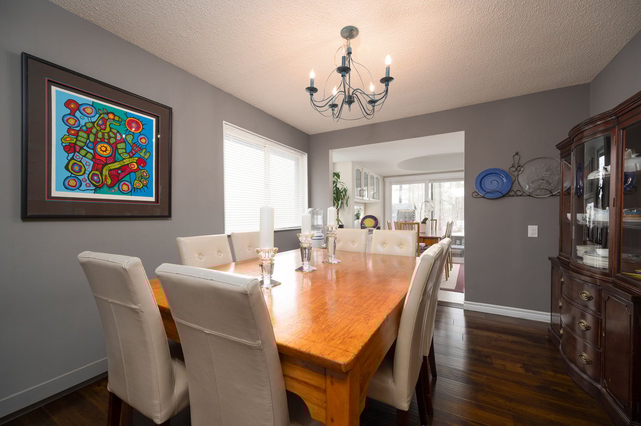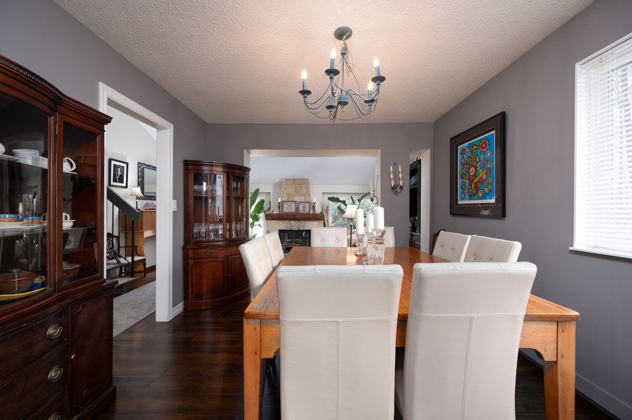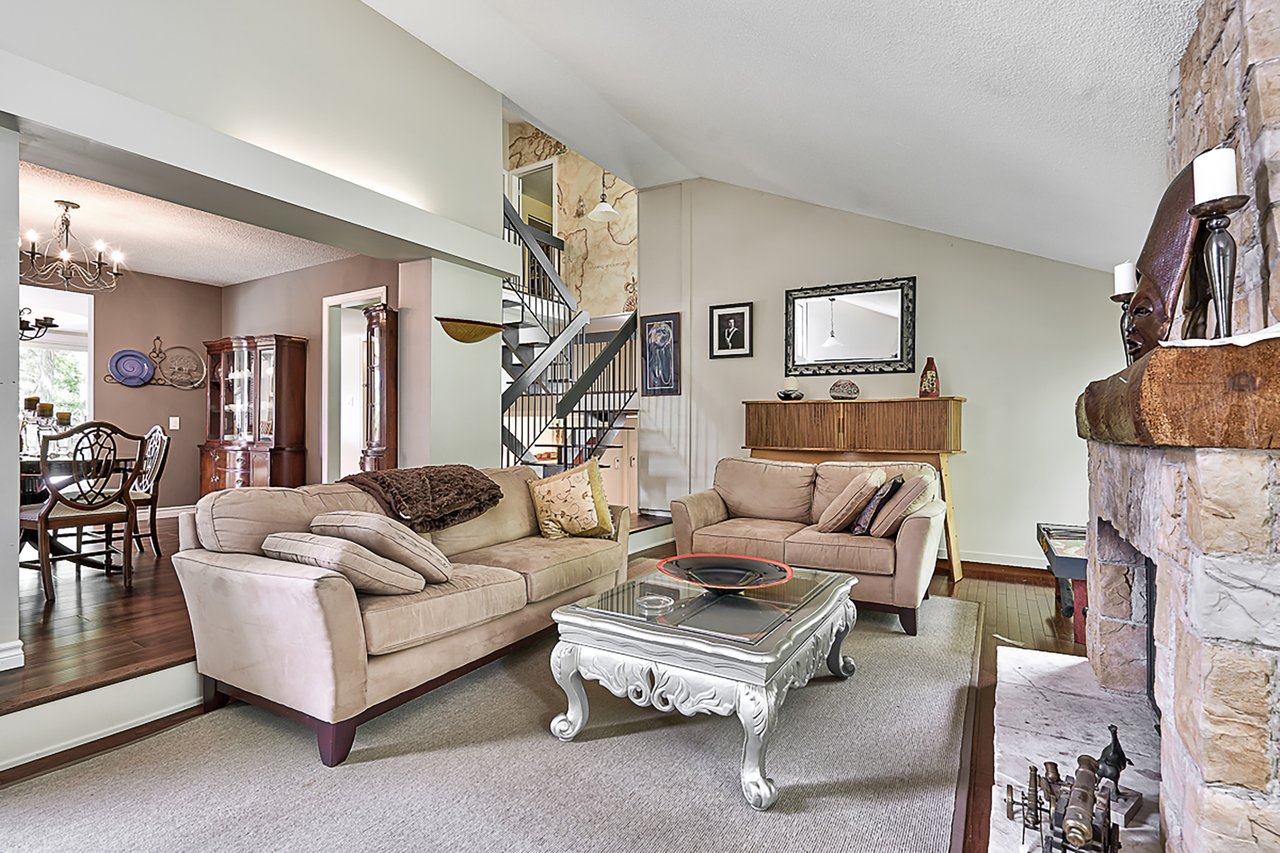 Inside, the home unfolds with warmth and architectural character. An open-to-above foyer leads to a sunken living room with vaulted ceilings, red oak hardwood floors, and a striking stone wood-burning fireplace. The main level also includes a formal dining room with hand-scraped hardwood floors, a powder room, laundry with built-in cabinetry and exterior access, and a tastefully updated kitchen with newer cabinetry, Corian countertops, breakfast bar seating, under-mount stainless steel sink, and pot lighting. A bright breakfast area with decorative recessed ceiling detail opens directly to the deck, creating easy indoor-outdoor flow.