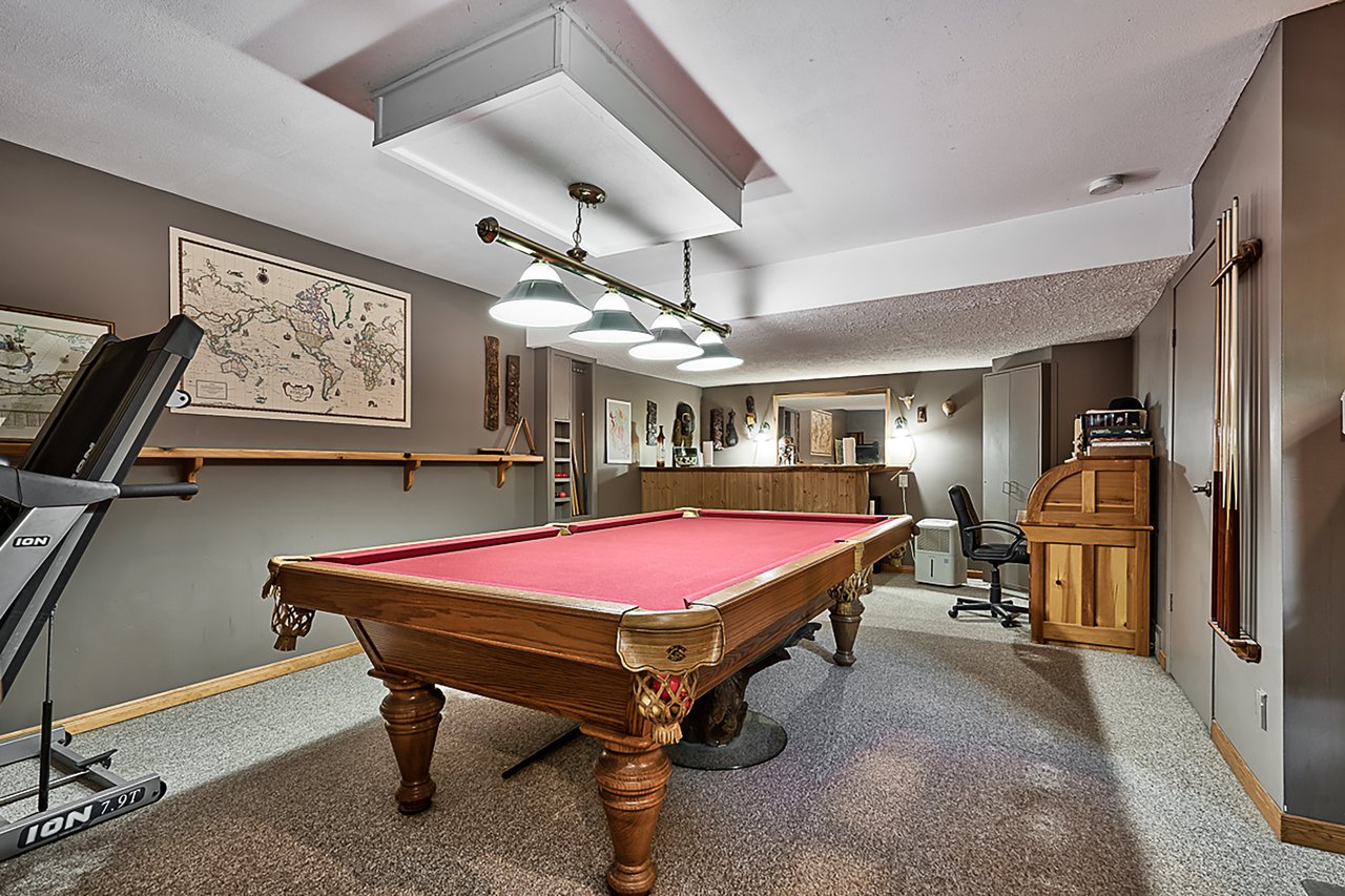 The finished lower level adds impressive flexibility with a recreation room featuring fireplace and built-ins, a billiards area with bar and desk space, a workshop, separate exterior access, and generous storage—ideal for work-from-home living or extended family use.