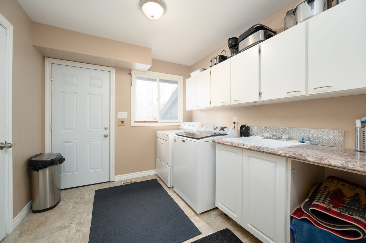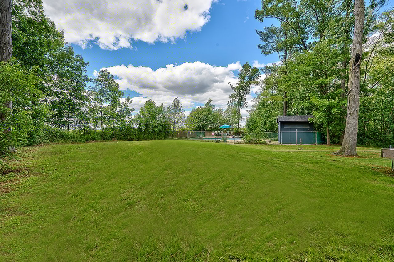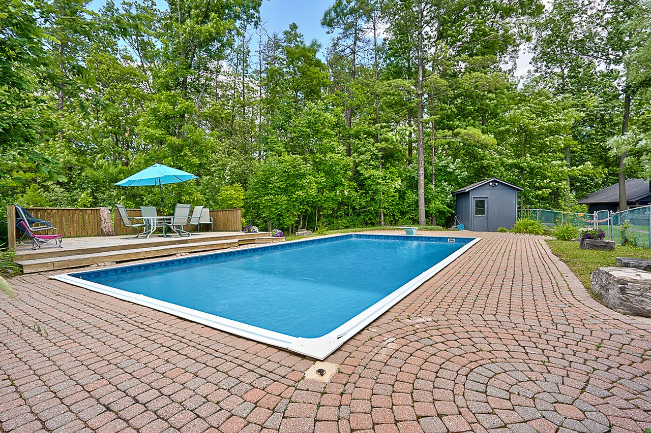 Outdoor living is a standout feature. An elevated wood deck overlooks an inground pool framed by interlock stone, with multiple areas for entertaining and unwinding. A pool shed with tiki bar, hammock space, and a six-person cedar barrel sauna create a resort-like atmosphere designed for year-round enjoyment.