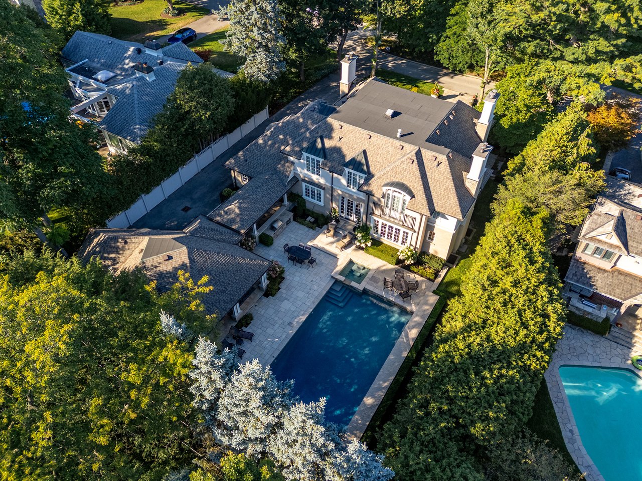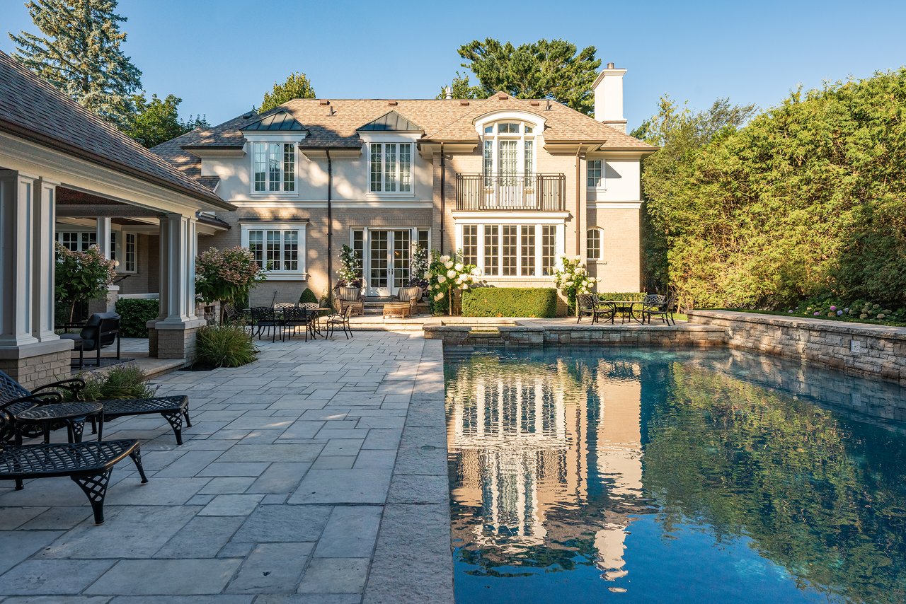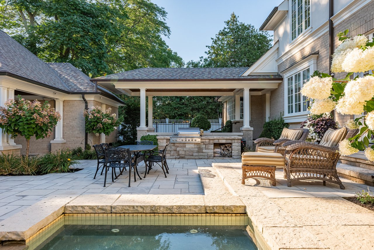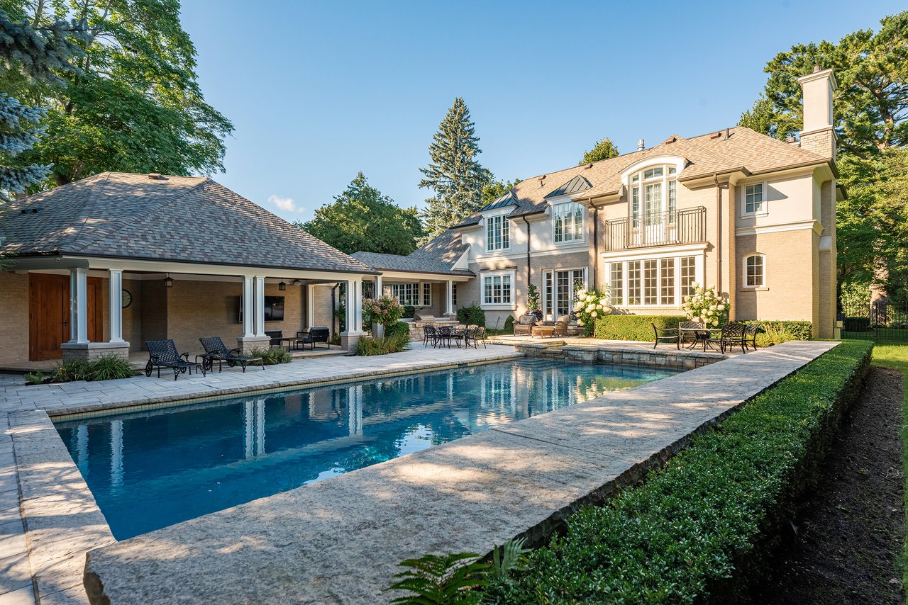 Outdoors, the rear gardens deliver a true resort-like setting. An inground pool, covered patio, outdoor kitchen, and multiple lounging and dining zones create the ultimate private retreat for warm-weather living. Professionally landscaped grounds frame the home beautifully, with mature trees enhancing privacy and curb appeal.