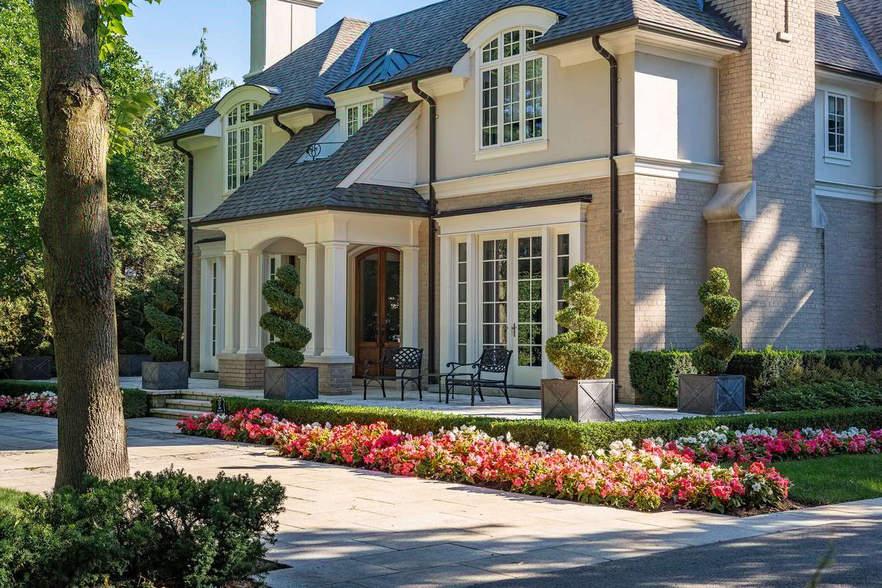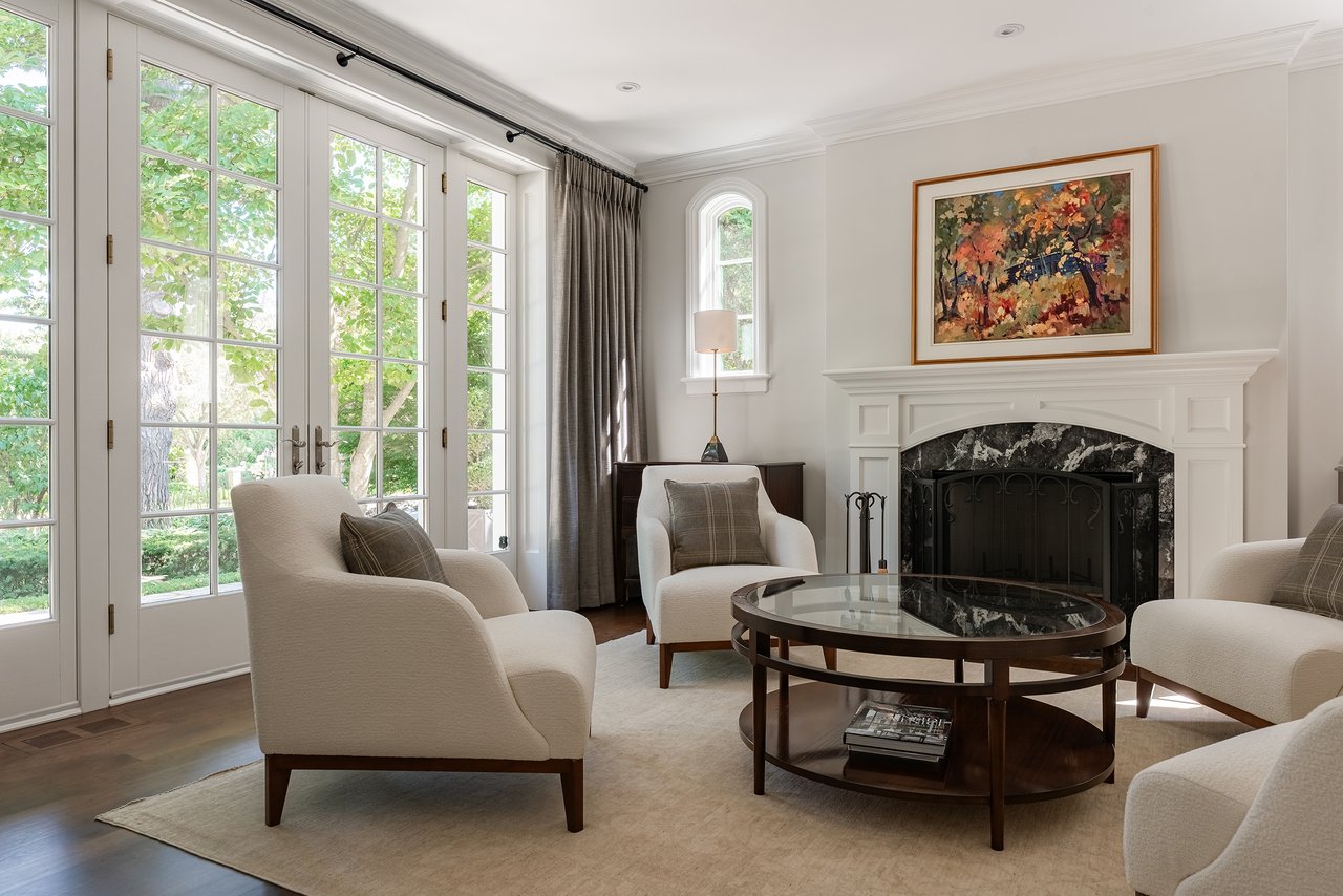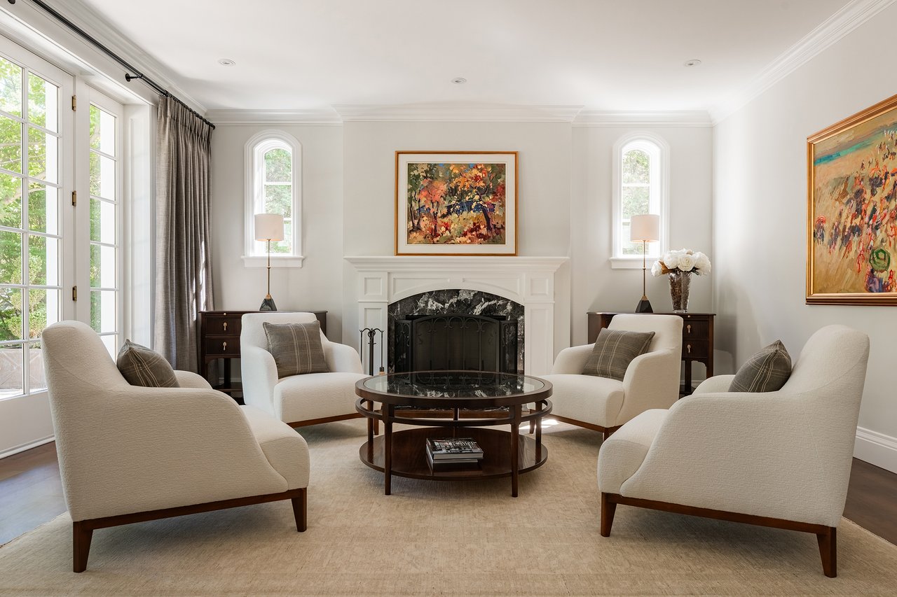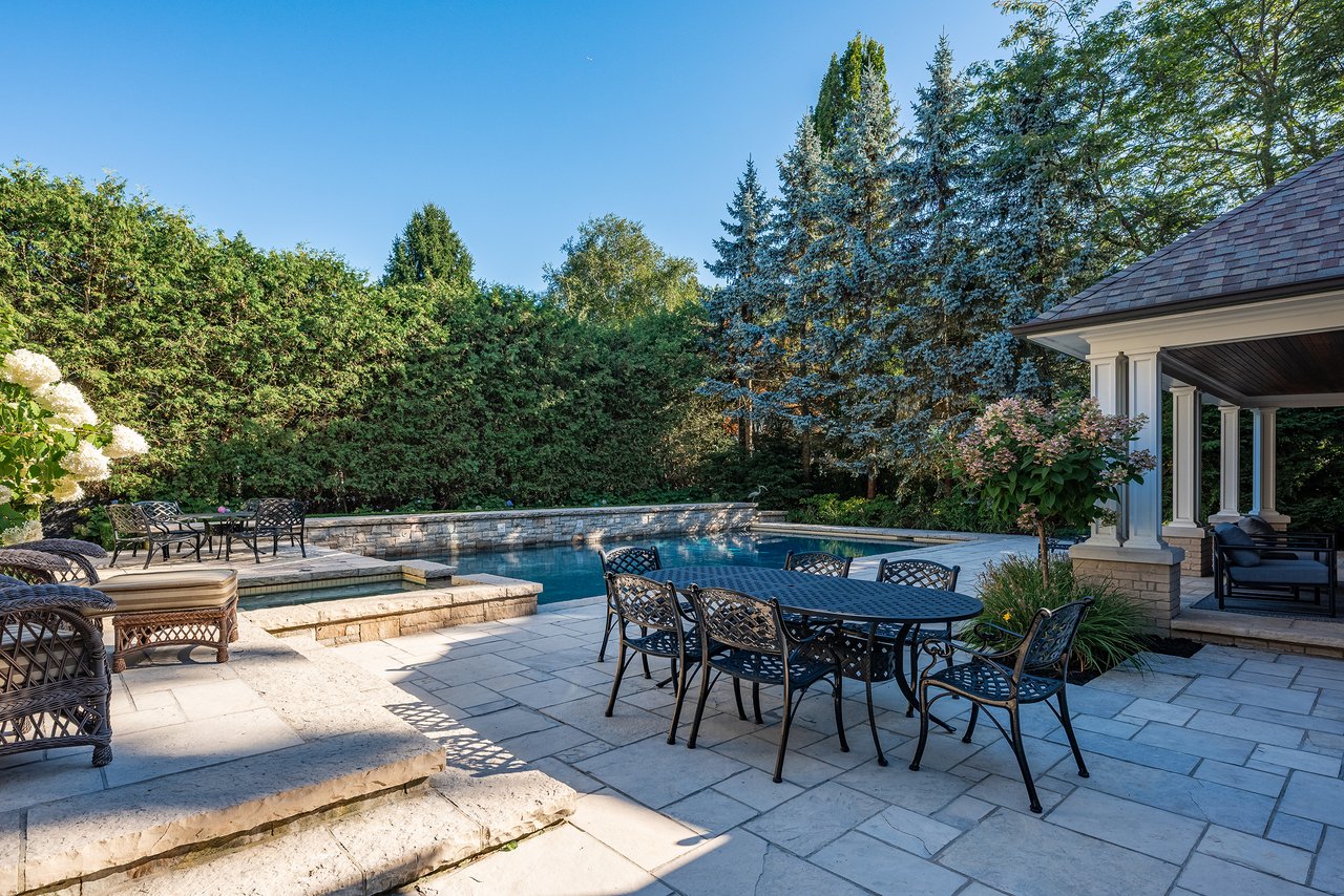 Outdoors, the rear gardens deliver a true resort-like setting. An inground pool, covered patio, outdoor kitchen, and multiple lounging and dining zones create the ultimate private retreat for warm-weather living. Professionally landscaped grounds frame the home beautifully, with mature trees enhancing privacy and curb appeal.